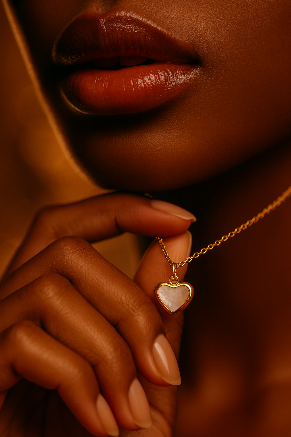 Collier et boucles assorties en forme de cœur nacré beige, sertis de doré. Un set tendre et élégant pour sublimer votre style.
