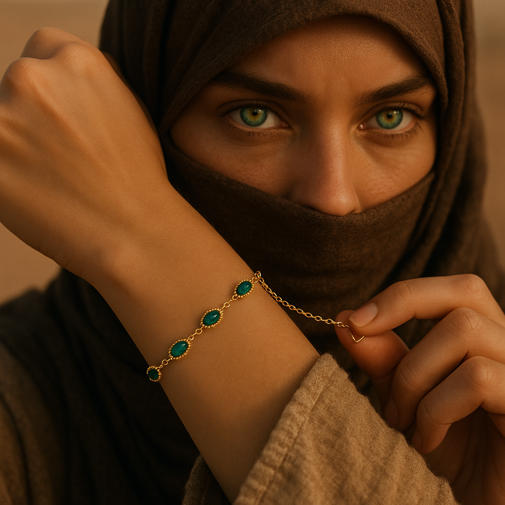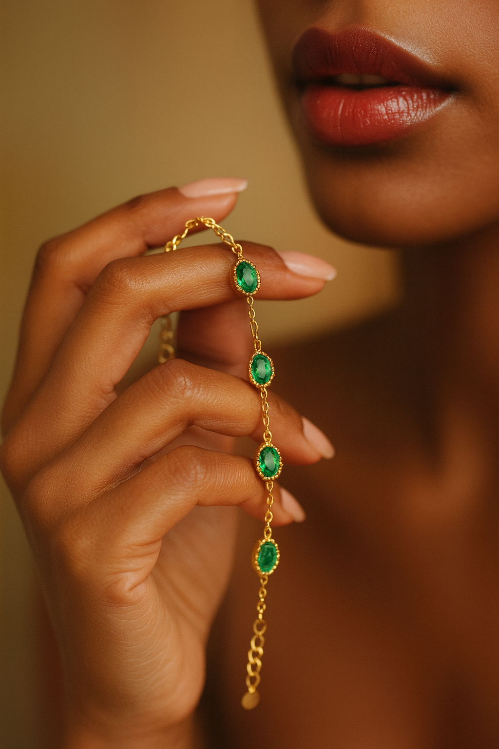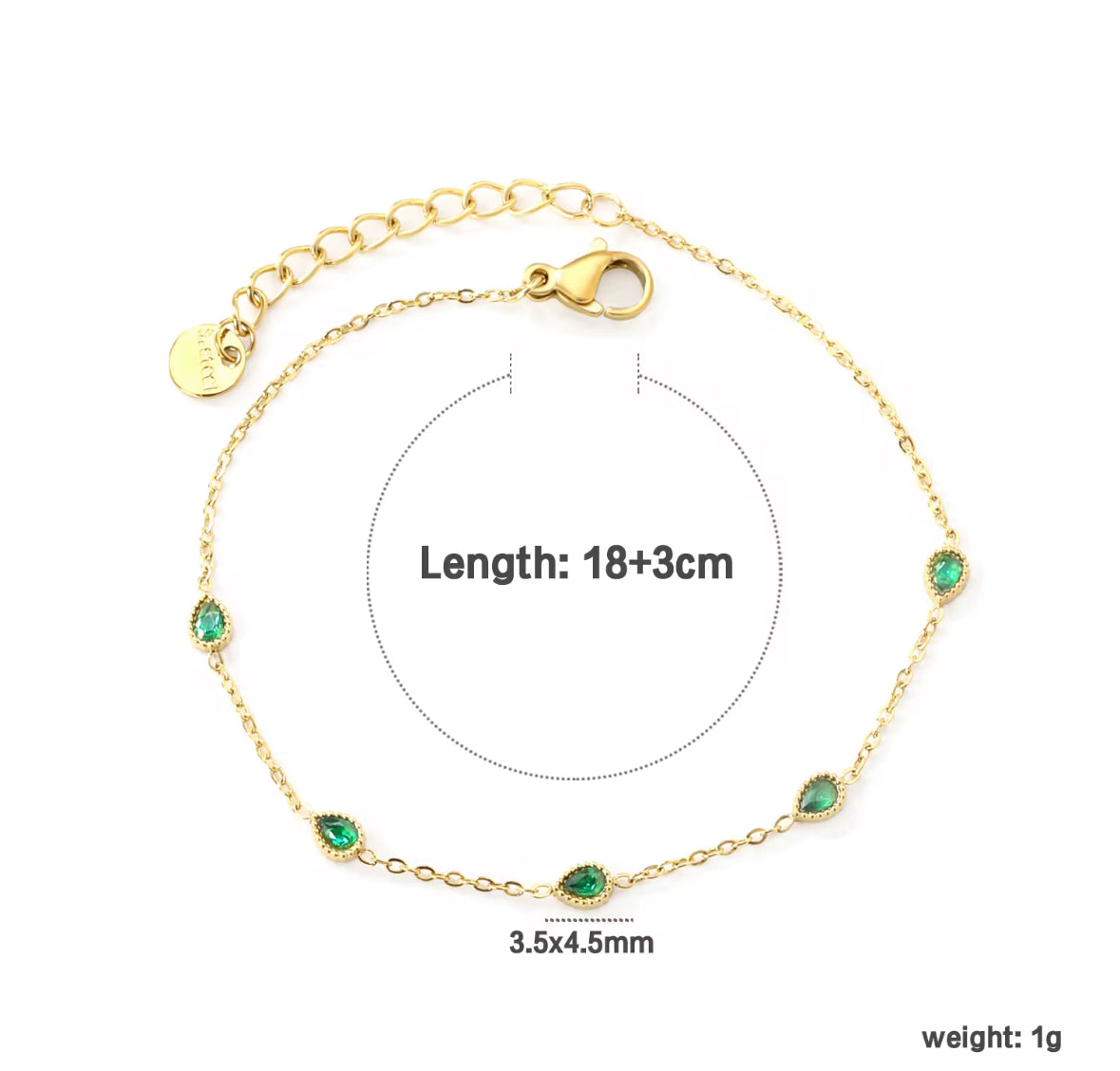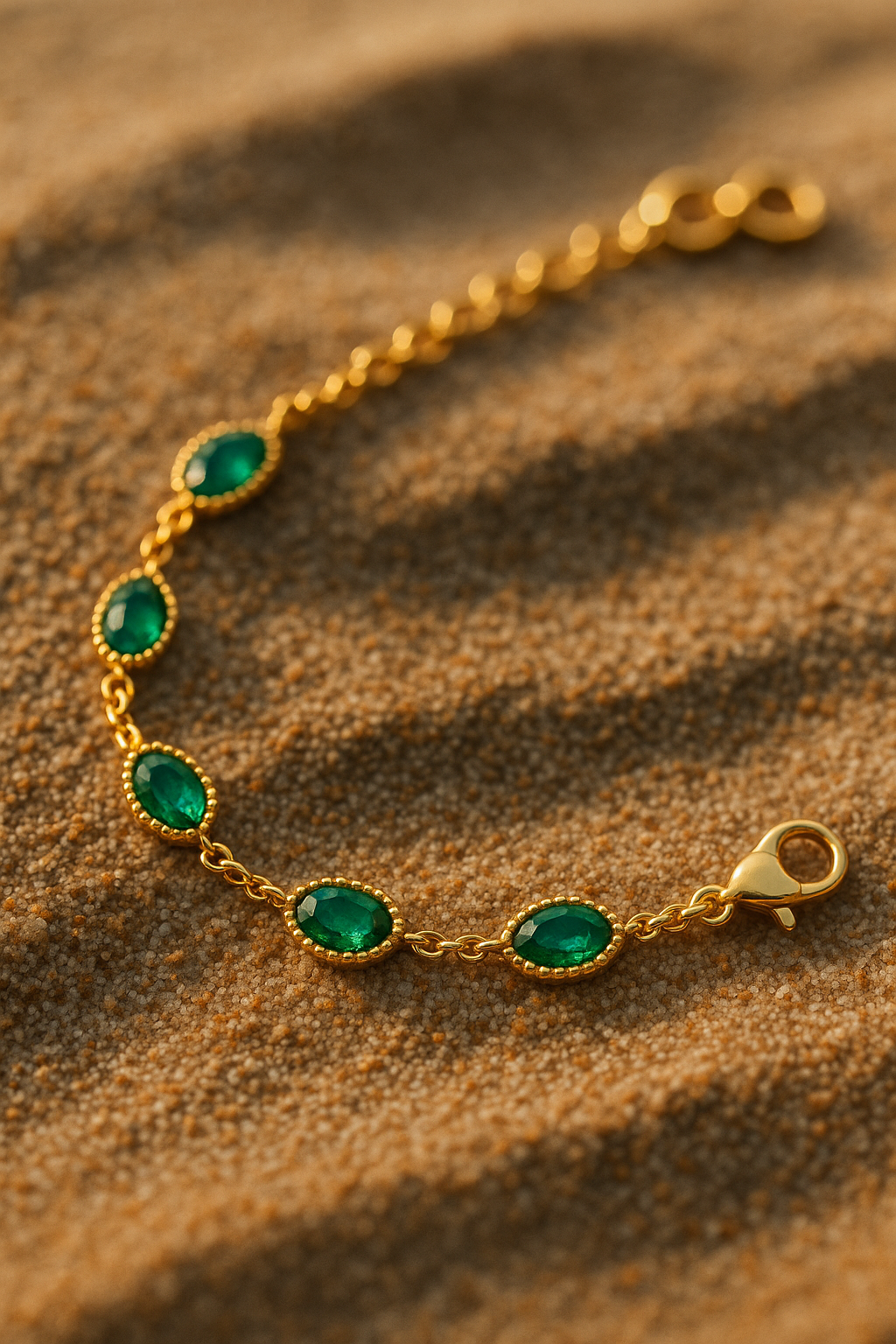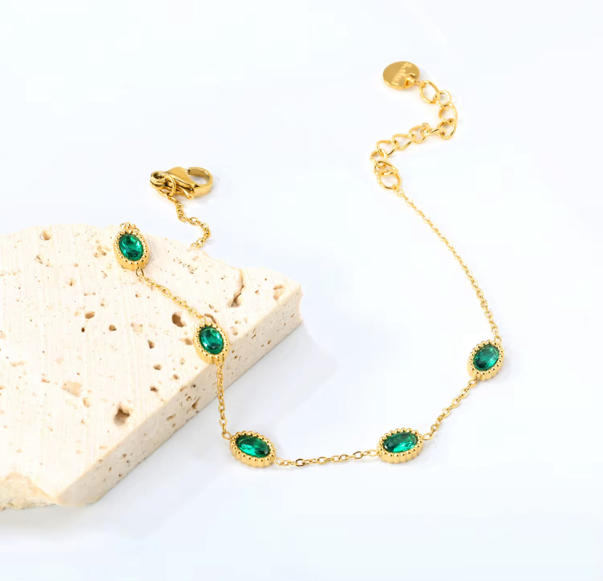 Un bracelet raffiné en acier doré, orné de pierres vert émeraude éclatantes. Parfait pour ajouter une touche de luxe à votre poignet.