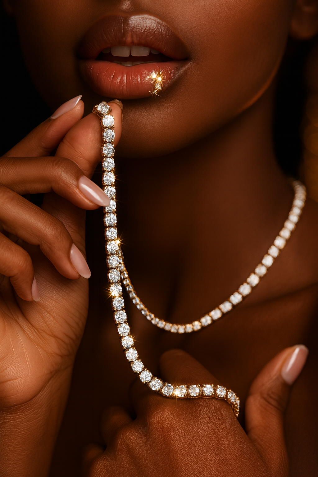 Un collier et un bracelet tennis sertis de zircons étincelants, disponibles en 3mm, 4mm ou 5mm. L’éclat intemporel de l’or 18K allié à la brillance des pierres, pour un look sophistiqué et luxueux.